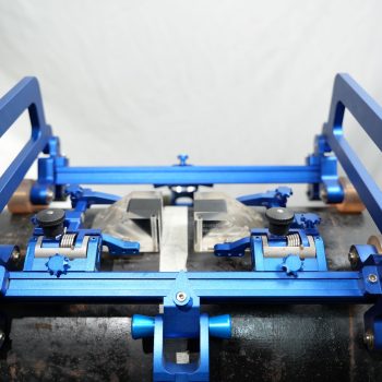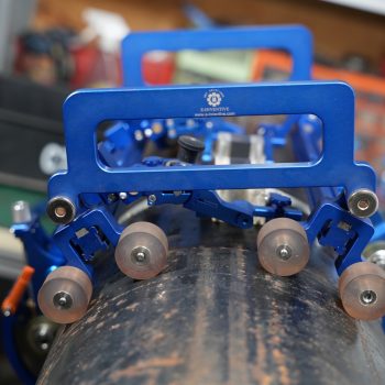 The ESCOVE LINKED Scanner, combined with the ESCOV scanner (ESCOV SCANNER – E-INVENTIVE) and additional chain links, facilitates easy inspection of circumferential welds, making it particularly suitable for non-magnetic materials. It is equipped with eight magnetic wheels (or PU wheels for non-Ferrous materials) to ensure the probe holder operates smoothly and steadily, accommodating up to six probes.